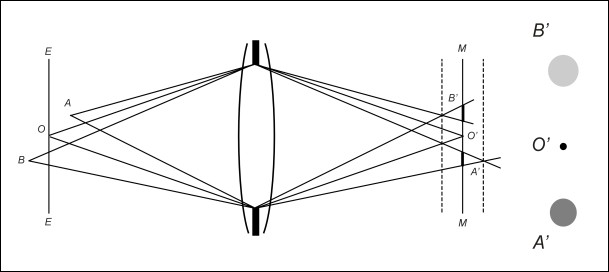 ~ Так как для конуса с вершиной в точке O': S' < S, то, следовательно, Q' < Q. 5. Аберрации объектива также могут вносить свой вклад в виде искажений формы изображения высококонтрастных малоразмерных источников и (или) перераспределения их яркости (рис. 12).