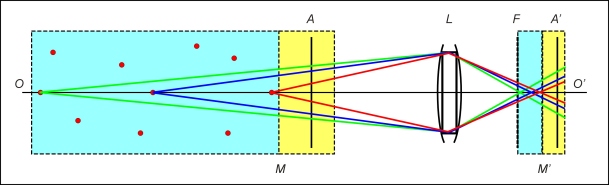 L – объектив, F – фокальная плоскость объектива (задняя), A – плоскость фокусировки,A' – сопряженная плоскость изображения. Область резко изображаемого пространства и сопряженная ее область пространства фокусировки показаны желтым цветом. Область «нерезкости» показана голубым цветом. Малоразмерные (точечные) источники в области «нерезкости» показаны красным цветом. Рисунок 9