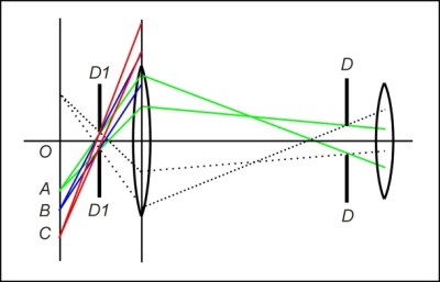 Лучи, исходящие из точки A показаны зеленым цветом, из точки B – синим, а из точки C – красным. Пунктиром показаны лучи, исходящие из точки, расположенной по отношению к точке A симметрично относительно оптической оси. Рисунок 10 — Прохождение лучей через объектив (фрагмент)